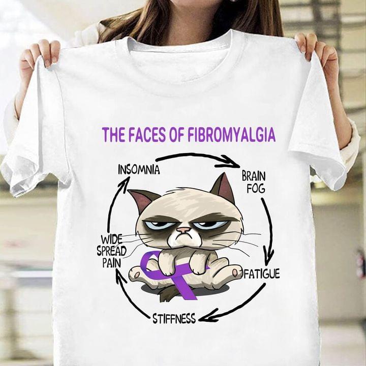 The Faces Of Fibromyalgia Insomnia Wide Spread Pain Stiffness Fatigue Brain Fog Cat Purple Ribbon Shirt