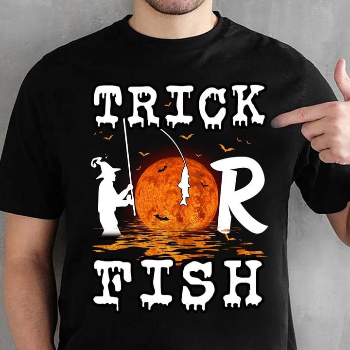 Trick Or Fish Fisherman Red Moon Halloween Shirt