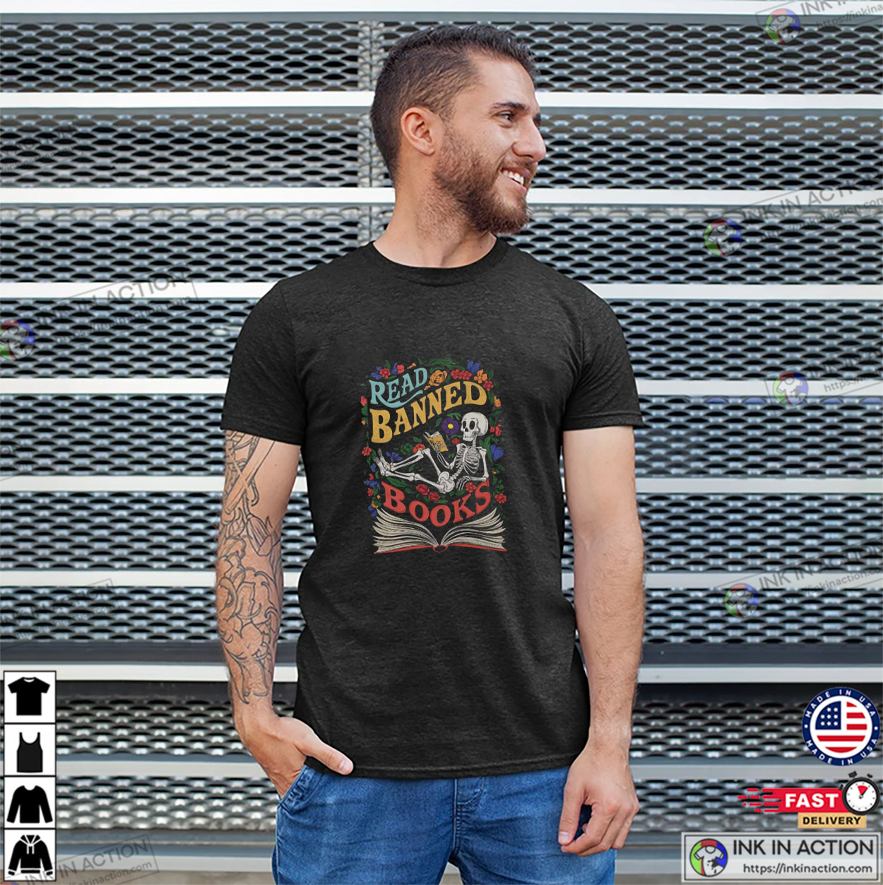 Vintage Flowers Lover Skeleton Read Banned Books T-shirt