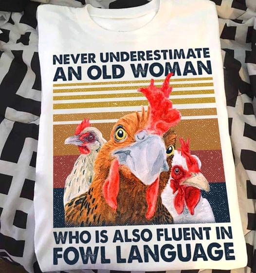 Vintage Never Underestimate An Old Woman Who Is Also Fluent In Fowl Language Chickens Shirt