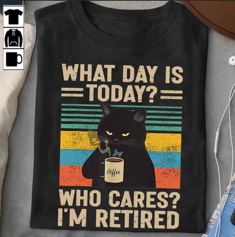 What Day Is Today, Who Cares, I Am Retired, Vintage Old Coffee Black Cat Shirt