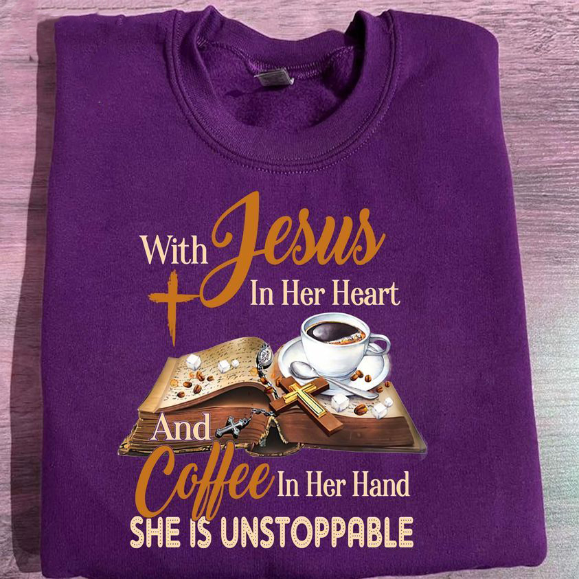 With Jesus In Her Heart And Coffee In Her Hand, She Is Unstoppable Shirt