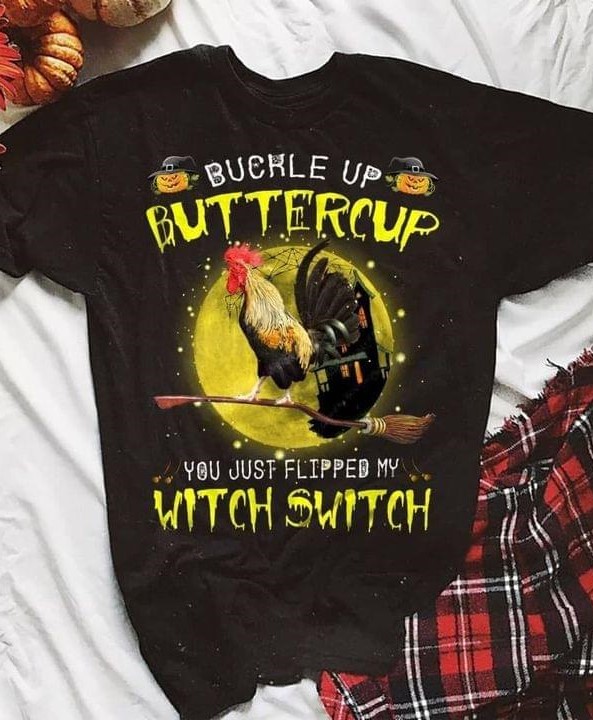 Buckle Up Buttercup You Just Flipped My Witch Switch Chicken Riding Broom Castle Halloween Shirt