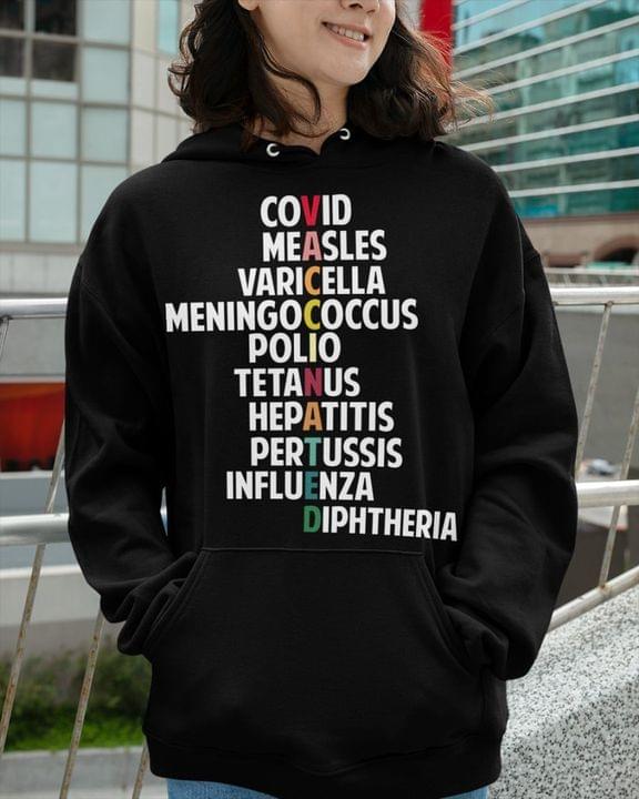 Covid Measles Varicella Meningococcus Polio Tetanus Hepatitis Pertussis Influenza Diphtheria Vaccinated Shirt
