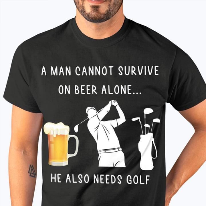 A Man Cannot Survive On Beer Alone He Also Need Golf Glass Of Beer Golf Player Bag Shirt