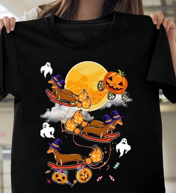 Dachshund Dogs Riding Brooms Pumpkins Moon Ghosts Halloween Shirt