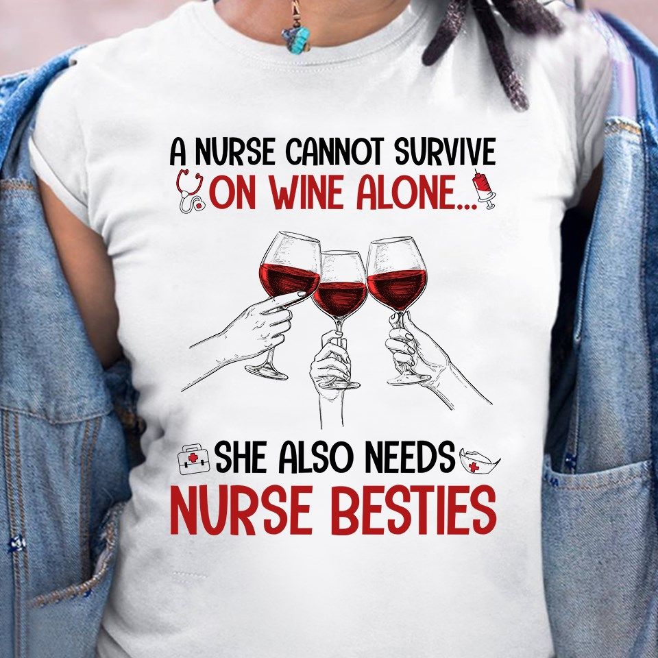 A Nurse Cannot Survive On Wine Alone She Also Needs Nurse Besties Shirt