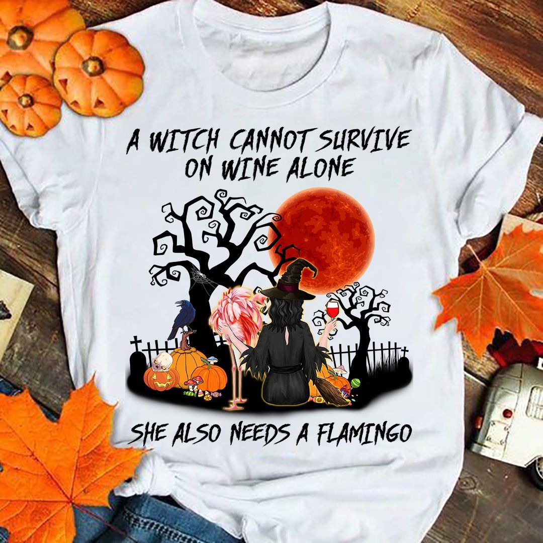 A Witch Cannot Survive On Wine Alone She Also Needs A Flamingo Halloween Shirt