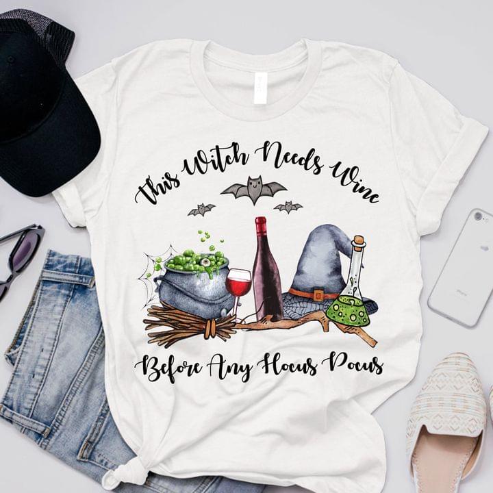 A Witch Needs Wine Alone Before Any Hocus Pocus Witch Hat Broom Red Wine Halloween Shirt