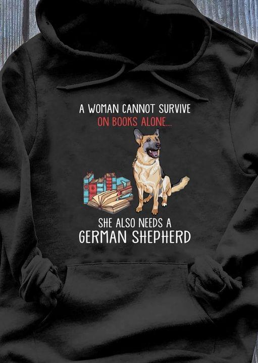 A Woman Cannot Survive On Books Alone She Also Needs A German Shepherd Dog Books Shirt