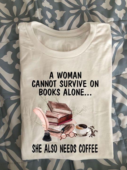 A Woman Cannot Survive On Books Alone She Also Needs Coffee Glasses Shirt