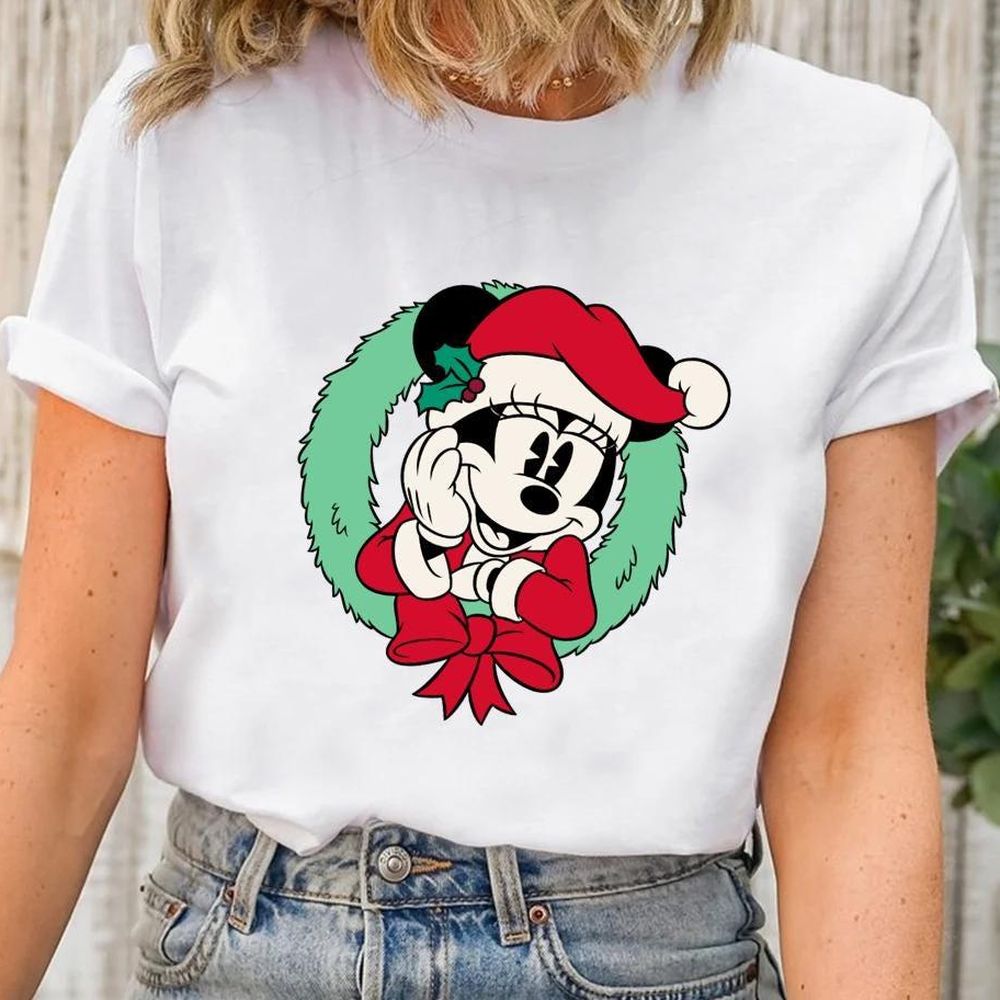 Disney Minnie With Santa Hat And Christmas Wreath Portrait Vuitino Shirt