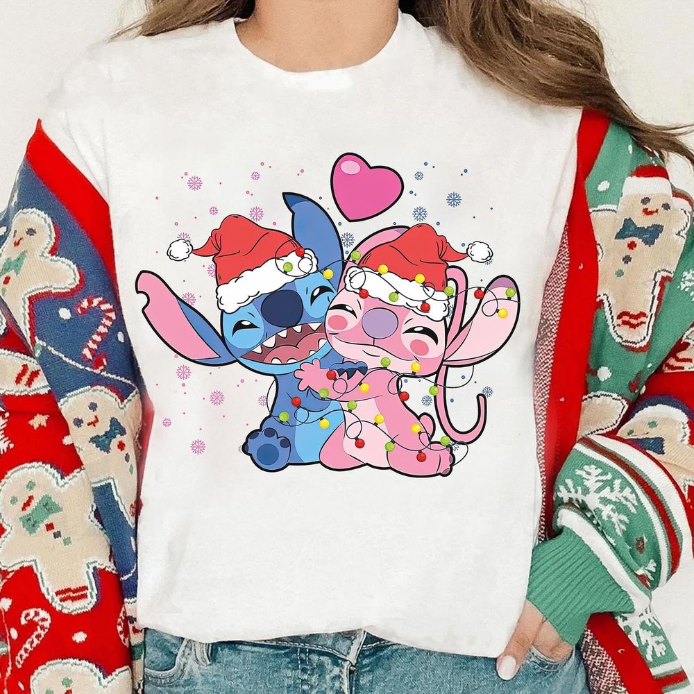 Disney Santa Stitch And Angel Christmas Lights Vuitino Shirt