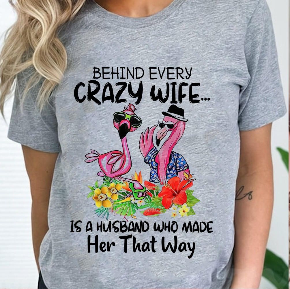 Flamingo Behind Crazy Wife Is A Husband Who Made Her That Way Shirt