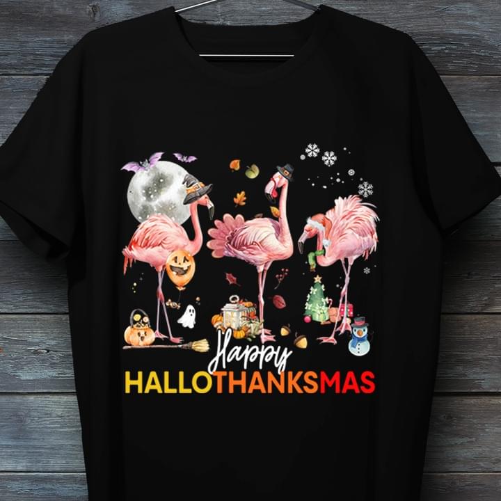 Happy Hallothanksmas Flamingoes Holidays Halloween Thanksgiving Christmas Shirt
