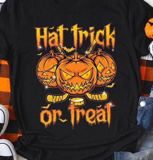 Hat Trick Or Treat Creepy Pumpkins Halloween Hockey Shirt