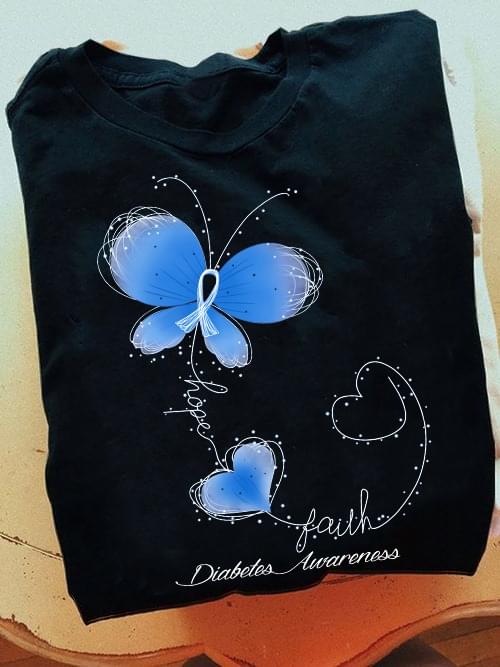 Hope Faith Diabetes Awareness Blue Butterfly Heart Shirt
