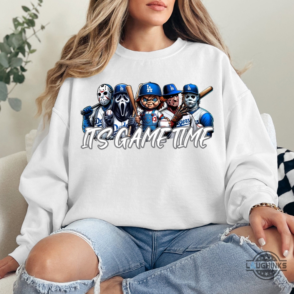Horror Characters In La Dodgers Uniform T Shirt Sweatshirt Hoodie Halloween Baseball Graphic Tee Laughinks 1