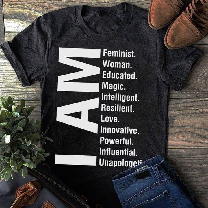 I Am Feminist Woman Educated Magic Intelligent Resilient Love Innovative Powerful Influential Unapologetic Shirt