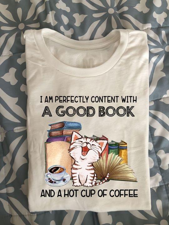 I Am Perfectly Content With A Good Book And A Hot Cup Of Coffee Happy Cat Shirt