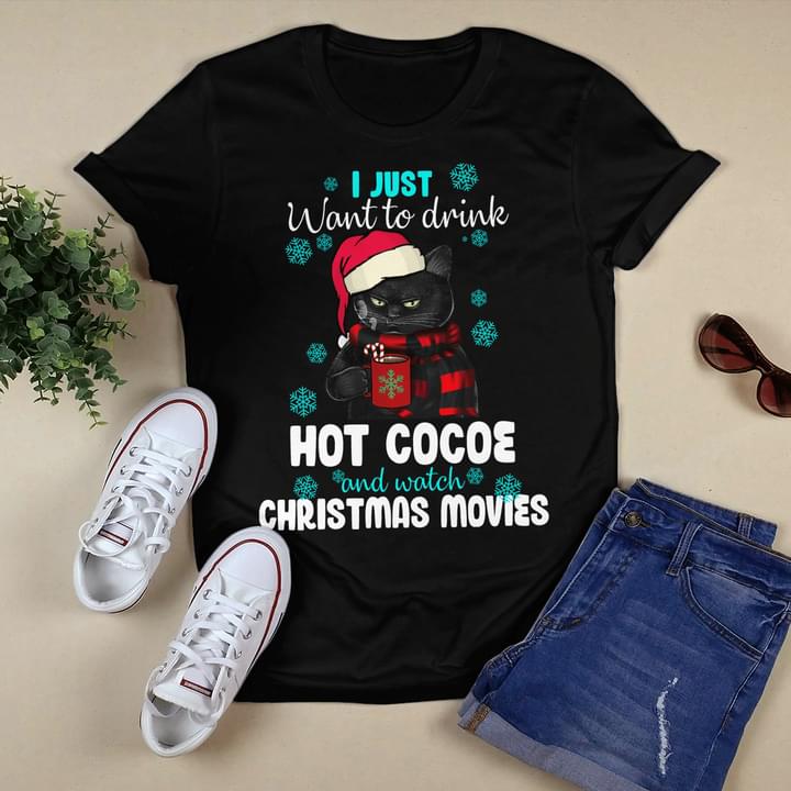 I Just Want To Drink Hot Cocoe And Watch Christmas Movies Black Cat Shirt