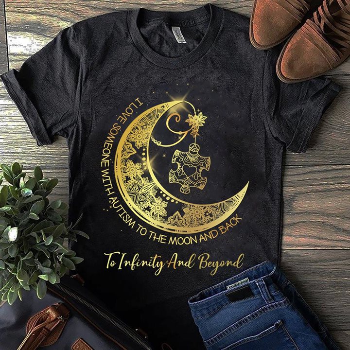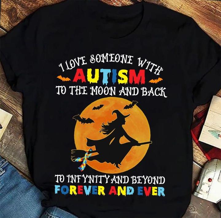 I Love Someone With Autism To The Moon And Back To Infinity And Beyond Forever And Ever Flying Witch Halloween Shirt