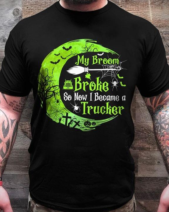 My Broom Broke So Now I Became A Trucker Moon Spiders Truck Halloween Shirt